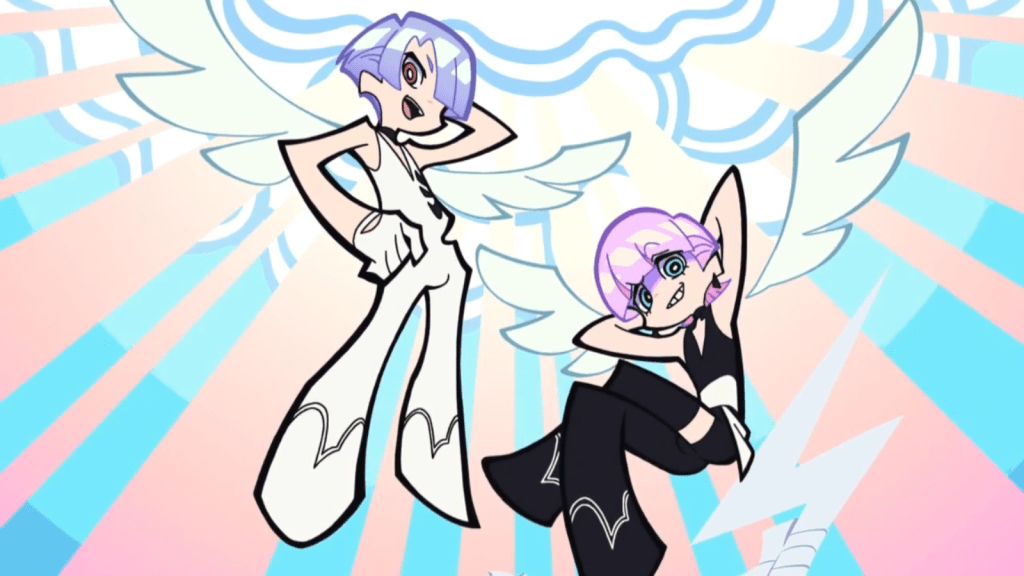 First, we had angel girls. Then we had demon girls. Now we have … angel femboys. Well, really, they are more masculine than not. They’re like boy pop idols who are also angels. Either way, their designs were cool and sexy. The boys’ names are Polyester and Polyurethane and they came to take away the Heavenly Licenses belonging to Panty and Stocking. They also turned Scanty and Kneesocks into a cursed demon horse. Pissed off, Panty and Stocking fought with the younger angel boys and had a ghost-shooting contest for Heaven Coins.