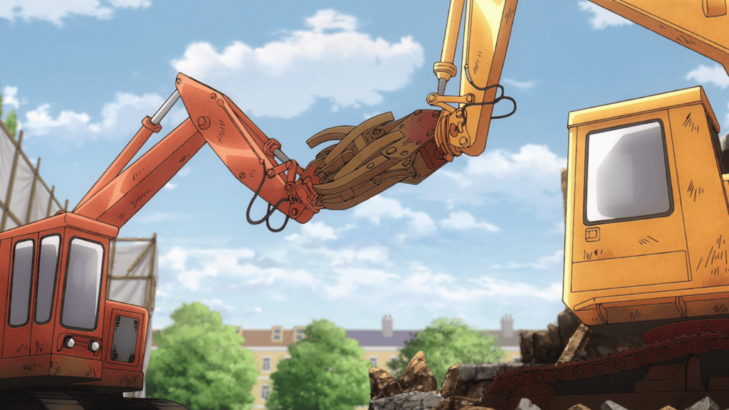 By telling her parents that she wanted to go home and study, Anya convinced them to start moving in the direction of the angry man. Before long, the Forgers saw a construction site. The angry man from earlier was working there, operating the clawed vehicle. After a bird pooped on his face, the already furious man completely lost it. He started rampaging. Luckily, Yor was there to rescue a nearby pedestrian, while Loid jumped into a second construction vehicle to battle the crazed worker.