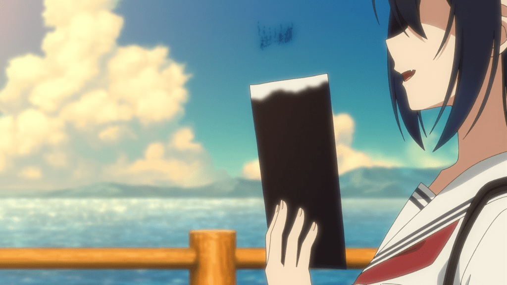 While Hinako and Miko enjoyed their time together, Shiori investigated Miko. Then she approached the two girls on the docks a little later. Shiori started to explain that Miko was in fact a yokai who had been decieving Hinako all this time. Much to Hinako’s horror, when asked where Miko lived or about her family, she could not answer. Shiori then showed the class registry, wherein Miko had written her name. But instead of Miko’s name being there, it was actually part of a spell. Yokai apparently use both spoken words and written words when using magic to decieve a human.