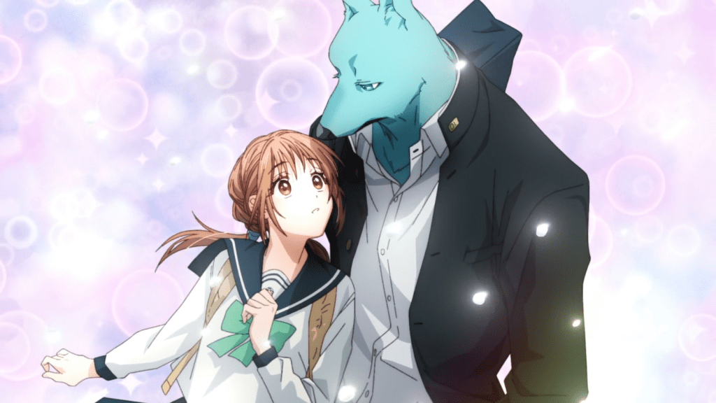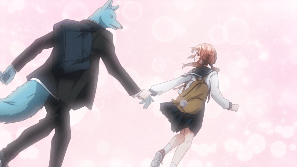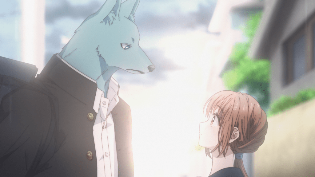 For the last section of this episode, we saw Mari and Tsunagu walk toward Mari’s home together. Tsunagu told Mari he went to the doctor and was told he was a normal beast-person who does experience true rut. He just needs to control himself better. Mari apologized – as if she needed to – for causing suffering. But Tsunagu said he was not suffering and that he was glad the person he was attracted to was Mari. They had a romantic moment standing close together at the cross-walk. Mari was overjoyed to be so close to Tsunagu as his body blocked the rain from hitting her.