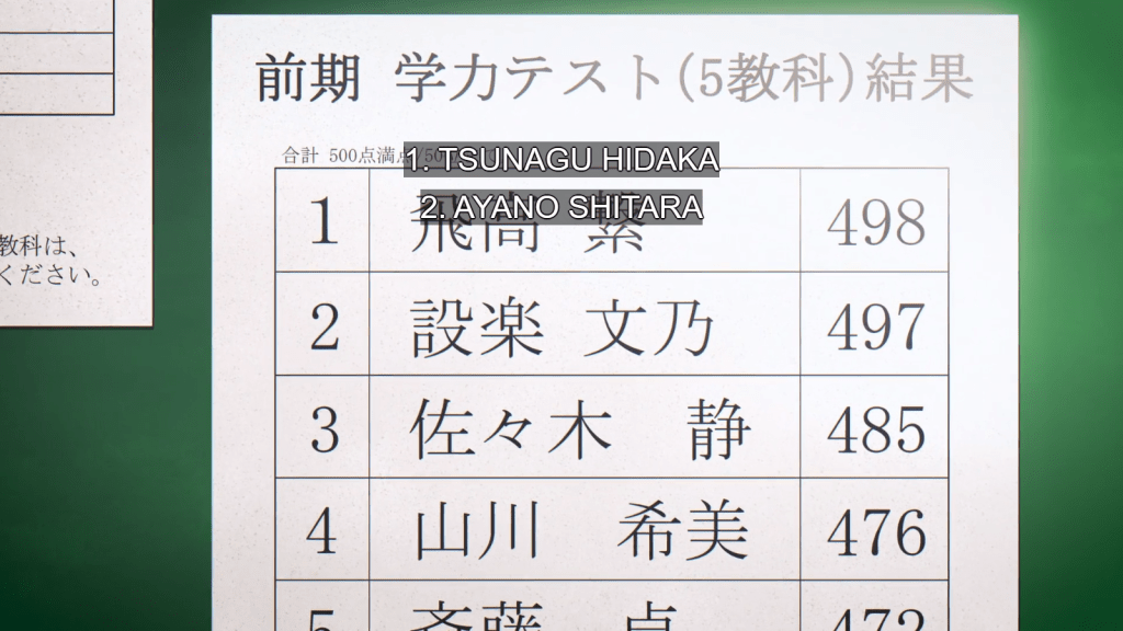 Ayano has a deep need to recognized, which is a very human thing, and very important for girls and young women. For her, the way to be truly “seen” would be to have her loved ones read her work. But Ayano’s parents refused to even look at her stories. They set harsh conditions, telling her they would only approve of her writing novels if she always scored highest in her class. That’s where this ties into the story of Tsunagu and Mari. When Tsunagu scored number one on the midterm exams, Ayano was devastated.