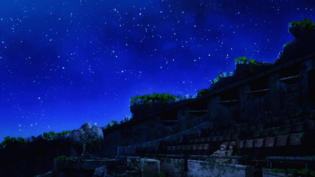 Airi assured Yoko that her glitch was fixed, and the girls went to the planetarium. The roof was completely gone, so they gazed up at the actual sky, which was clear and full of countless stars. After Yoko saw a satellite, she started to wonder if anyone could be looking down at them from space. Airi said it was possible, since humans did venture into space before the collapse of civilization. Unlike in our current world, there was a space station on the moon. Also, something called an orbital elevator was constructed. It could be that most of the population of Earth is now in space.