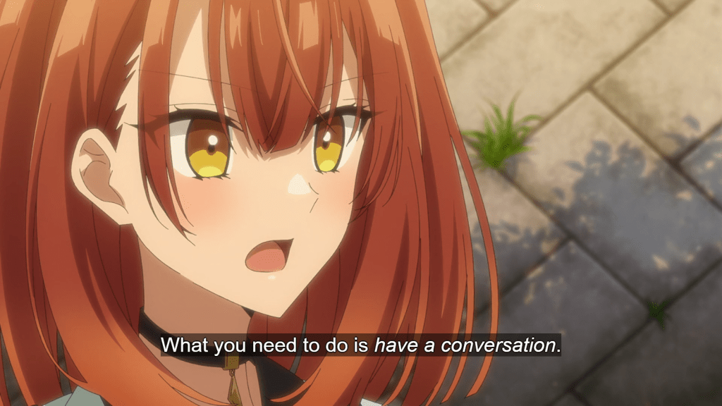 Shiori’s response was extremely telling. She said, “Conversation is only productive between those of shared values and status.” I strongly disagree with that statement. No wonder Shiori has never managed a relationship if she thinks this way. If that were true, I would never have conversations with people I disagree with, basically. That’s not a healthy way to live. Miko didn’t argue with the statement, but urged Shiori to adopt Hinako’s values if she really did care. Then the yokai went their separate ways. The episode ends with Shiori worried and wishing to make things right with Hinako.