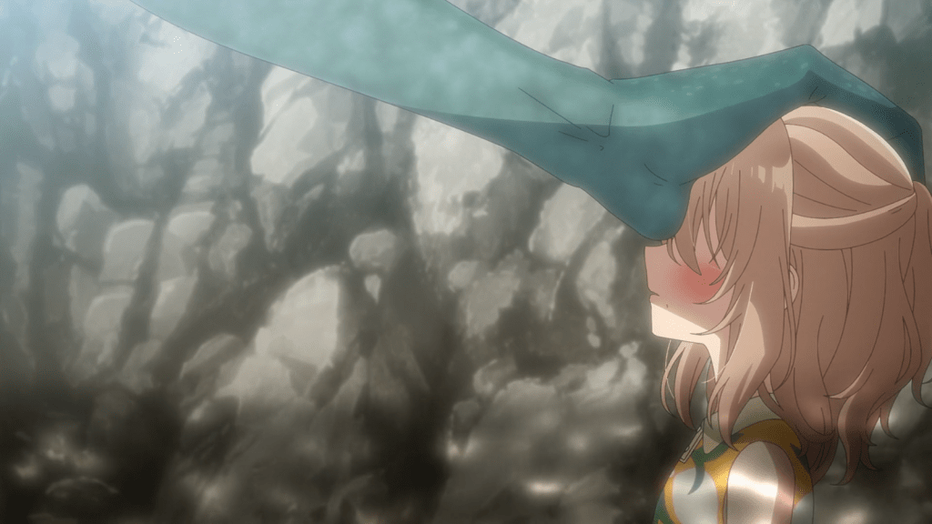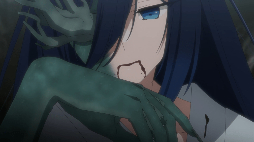 In this intense episode, we finally learned about Shiori and her backstory. Long ago – probably up to several centuries ago – she took up residence in a cove near a village of fishermen. The villagers occasionally abandoned their children in that cove. Shiori always happily devoured the young humans until one day, an especially emaciated girl was left in the cove. She was so skinny and wretched that Shiori had no desire to eat her. So, she allowed the quiet girl to live with her for many years.