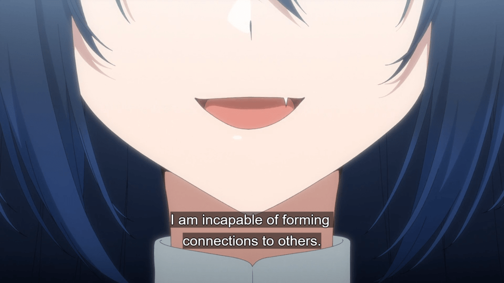 In one of Shiori’s most important lines (imo), she stated, “I am incapable of forming connections to others.” This confirms what I have already long suspected, that Shiori would qualify as a sociopath if she was human. (And since she sometimes devours people, she’s a psychopath, too.) But the best way to think of it is that Shiori is a “solitary animal.” She can recall no family, and exists only as a lonely predator. This is in contrast to Miko, who remembers that she had siblings and parents in the distant past. Animals like foxes are semi-social, and in Miko’s case, that probably disposed her to wanting to form connections with others. It was much easier for her than for Shiori.