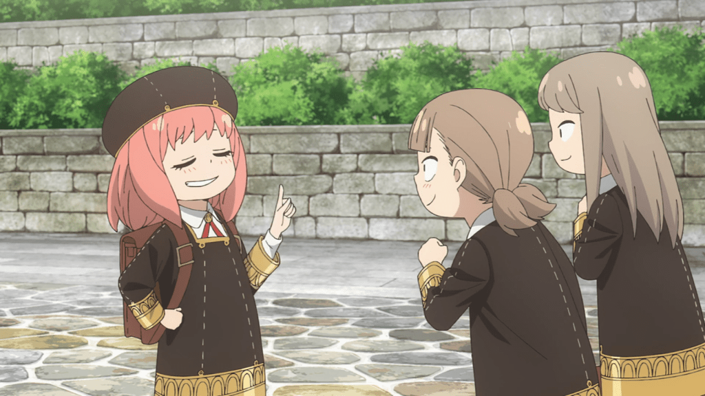 Loid was technically there for Anya, too. He was disguised as one of the secret police members surrounding the bus. Although he couldn’t reunite with her that night, he was worried about her. The next day, Loid gave Anya a ride to school and bought her some cake on the way to help “heal her heart.” Speaking of school, Anya was surprised when she arrived and was called “Anya-sama” (or “Anya the Hero” as Crunchyroll translated it) by some other kids. A small crowd formed around Anya, all praising her for her stella apologizing for things in the past. Anya suddenly realized she was popular.