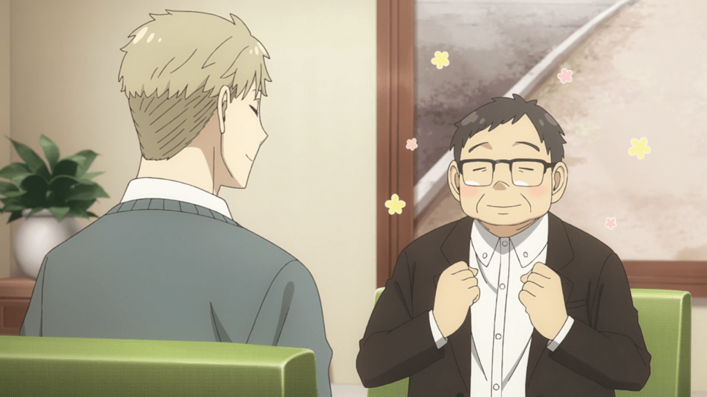 This installment was divided into three mini-episodes, though the third one was very short and appeared after the ending credits. In the first installment, we learned about Mr. Austin, one of the teachers at Eden College. He was also the one who was knocked unconscious by the busjackers. Since he was experiencing nightmares and other symptoms, he started seeing Loid Forger for psychiatric help. It didn’t take Loid long to figure out that Austin’s symptoms were not caused by the busjacking, but had been ongoing for several years. The source of the problem was his wife, who terrorized him daily with verbal abuse.