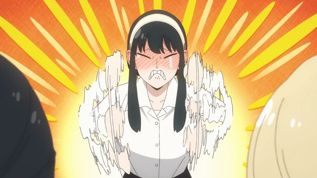 Yor stayed late at work to help her younger colleague (Camilla) finish up. After their work was done, Camilla, Millie, and Sharon invited Yor to come drink with them. We cut to the bar and Yor is already wasted, slurring her speech, and wobbling back and forth with a red face. In the absurd scene that followed, Yor became convinced that it was normal for a wife to want to murder her husband. She wanted desperately to be perceived as normal because her life basically depended on not getting reported to authorities. But even in her surreal drunken fantasy, Yor couldn’t go through with killing Loid. She definitely has a crush on him at this point, getting ridiculously flustered over the suggestion of even kissing him.
