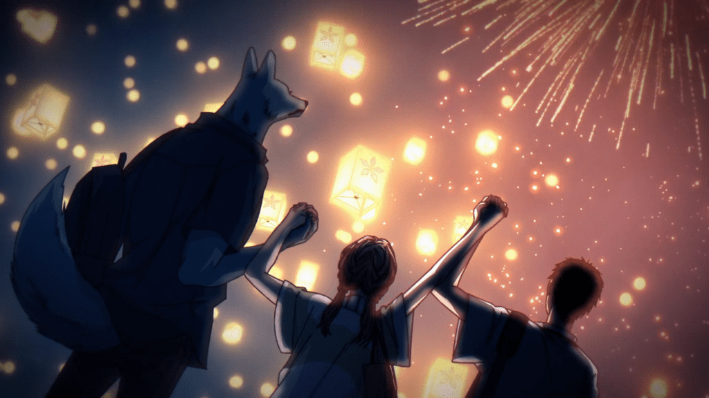 As they approached their destination, Yukihiro told Mari to close her eyes. She was holding hands with both Yukihiro and Tsunagu for support. When she opened her eyes, Mari beheld a beautiful scene. They were standing far above the town with a great view. Glowing paper lanterns were floating everywhere. Fireworks started as well. Yukihiro explained that both the humans and Beastfolk were having festivals today. The Beastfolk used paper lanterns and the humans set off fireworks. From this rare vantage point, one could see the lights from both celebrations. Mari, Yukihiro, and Tsunagu were once again breaking the boundary between their species and growing closer.