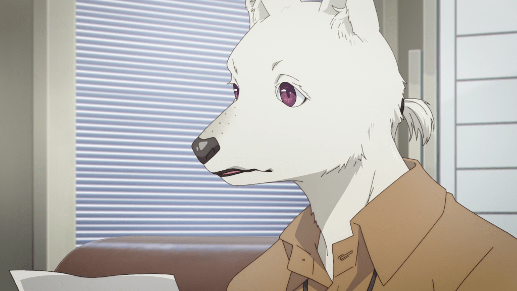 Mari acted quickly and jumped at Kisara so they both fell to the ground and weren’t hit by the dog-person. Kisara said it was reckless for a human to get involved, but Mari insisted that this showed her resolve to love Tsunagu and those around him. Suddenly, Tsunagu appeared and subdued the ruffian. The attacker was brought to the police station. Mari and Kisara also had to answer some questions for the police. The officer – a dog-person with white fur and gentle eyes – was very kind and apologized that this happened on Mari’s visit. His voice sounded very familiar, but I couldn’t place it by name, and MAL’s cast listing did not include him. (As of Dec ’25)