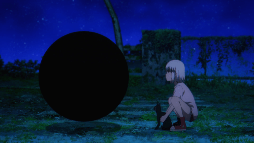 Airi woke up in the middle of the night and wandered around, sensing that something was calling her. She encountered a little black cat first. Together, they witnessed a brief time with the aliens. First, the nearby machines went berserk. There was a great light from above and gravity was altered slightly. Then the light disappeared and it looked like space itself was being twisted to form a wormhole. To Airi it looked like a black orb. The cat jumped in, but Airi tried to run. The eerie orb pursued her and caught up to her just as she dived into one of the Yoshimi caves for cover. When she opened her eyes again, Airi was floating in outer space with the black cat.