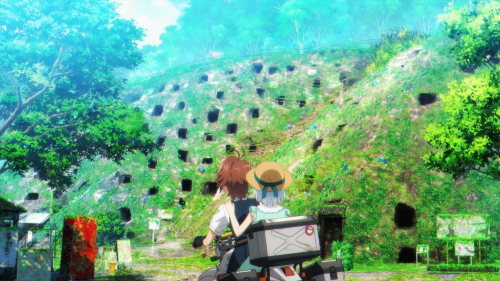 Where is the rest of humanity? I tend to think some of them managed to leave and live on the moon or in space (based on episode 7). The rest probably went extinct, but I’m not sure what event or series of events triggered that. The apocalypse may have been sudden, like a meteor crash or a nuclear war; or it might have been a slower decline brought about by multiple causes (such as climate change). At the end of the day, this anime is about touring after civilization has ended, so we may never know why it ended. It’s not the focus of this story. However, I would have liked the anime better if it provided some answers instead of being vague about the world-building for the entire season.