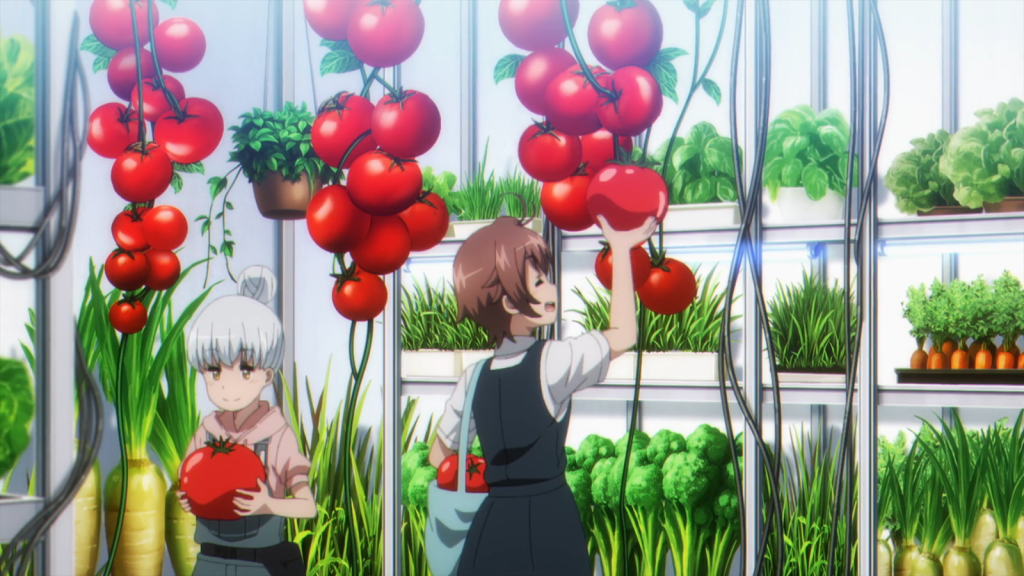 At the shelter, Yoko and Airi participated in education classes instructed by Onee-chan over what looked like a web camera. The girls also engaged in VR training to do practical things like butcher animals. They played soccer with a little goal robot, who fell over and broke after losing the game. Yoko also remarked that the food was always plain and bland. Those facts make it seem like the shelter was nearing the end of its usefulness. Speaking of food, Yoko and Airi also took care of the crops. We saw them harvesting some mega-tomatoes that looked amazingly fat and delicious.