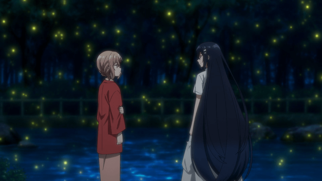 After a meal and a bath in the fancy inn, Miko started craving icecream. This was probably a pretense and what she really wanted was for Shiori and Hinako to talk things out and process their emotions more. So, Miko asked Hinako and “Fish girl” to go buy some icecream from the nearby convenience store. Miko looked extra adorable in her pajama kimono, sprawled on the futon, melting in relaxation. I laughed when she said she had become one with the futon. Shiori shot a glare at Miko for setting up the situation, but she left with Hinako regardless. Miko wins again.