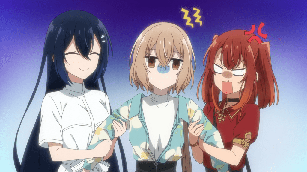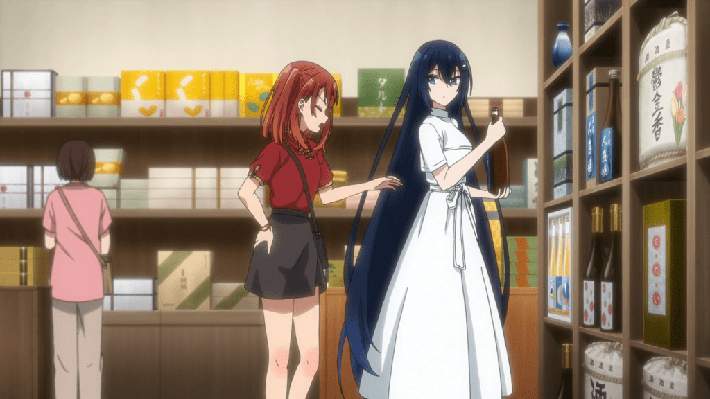 Though Shiori and Miko were constantly bickering, it still seemed like everyone was having fun. I think the dynamic between Shiori and Miko is classic and funny. Together, the trio looked around the town and had some cute and funny moments. One scene that I especially liked was when Shiori picked up a large bottle of sake in the store and said, “I know what I want.” Miko had to explain that they can’t buy alcohol when disguised as highschoolers. Throughout the trip, Shiori started to realize that Miko was also looking after her and trying to be mindful of her feelings.