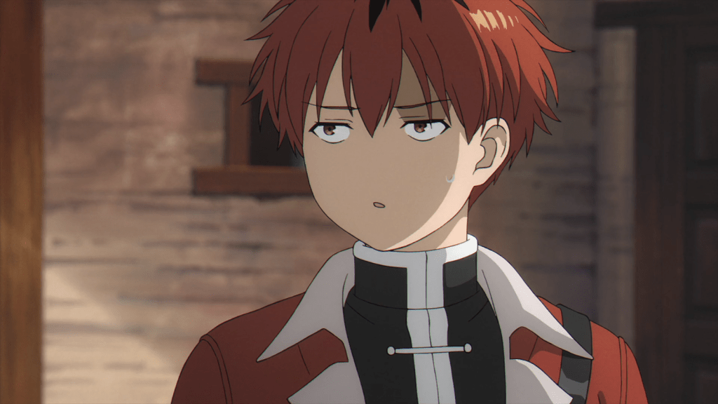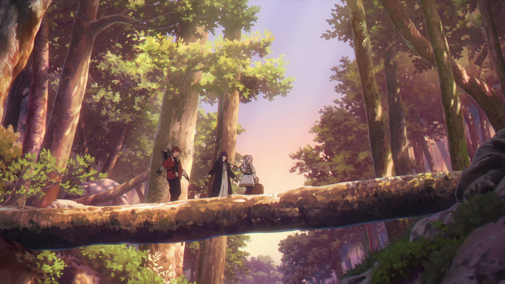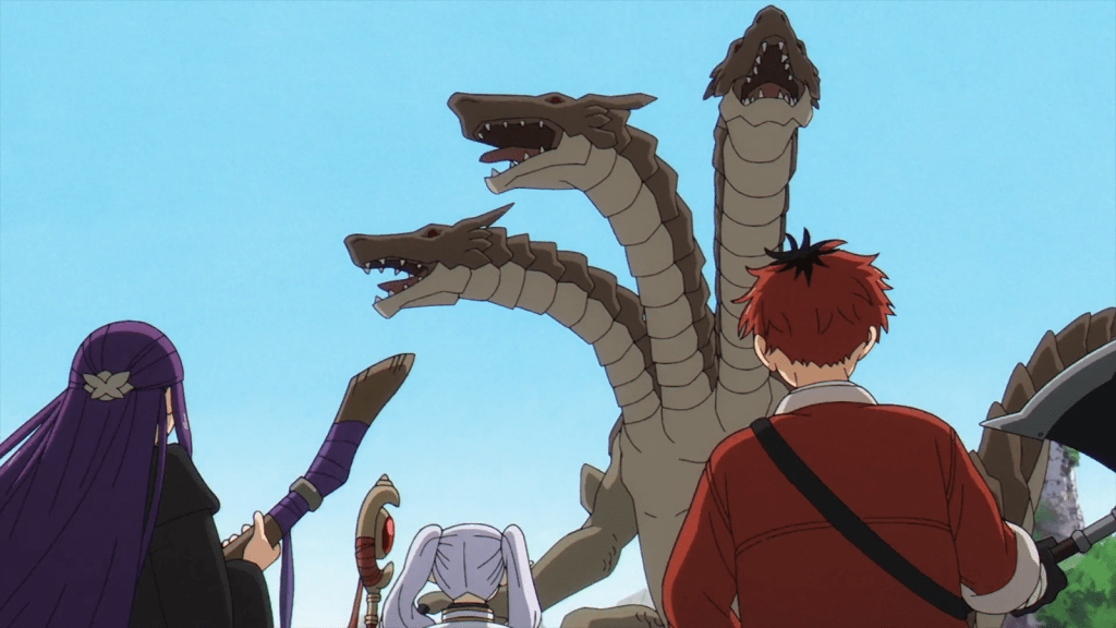 Frieren and company were in an unusually temperate area of the North. Due the volcanic activity in the vicinity, the air was warmer and there were hotsprings in some towns. The village that Frieren remembered from her journey with Himmel was gone. The springs dried up and the people left about thirty years ago. Only one family remained in a cottage. The old man at the cottage said there was a hidden hotsprings in the Etwas Mountains about a week’s journey away. Frieren and Fern agreed to go there because Stark wanted to see the hidden hotsprings. He seemed to know the name “Etwas” from some memory, but he didn’t elaborate until later in the episode.