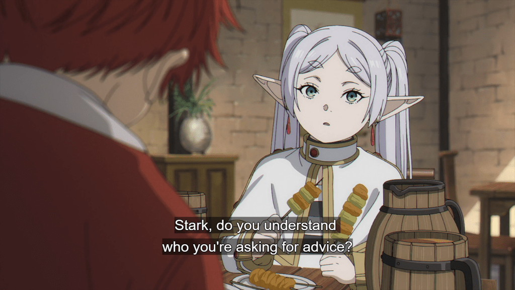Frieren’s first question was whether Stark was right in the head for asking her for dating advice. This was a funny moment but also sort of impressive, since it shows how Frieren has developed more self-awareness. She and Stark were sitting at a tavern and talking. During their conversation, Frieren complained about how Stark compared her to a grandmother. If Stark were to insult her age one more time, Frieren threatened to break down and cry. We then saw a flashback of sometime in the past, when the elf girl threw a tantrum over an unspecified issue. She cried and wailed for three days and three nights. Even Himmel the Hero was frightened of Frieren’s tantrums.