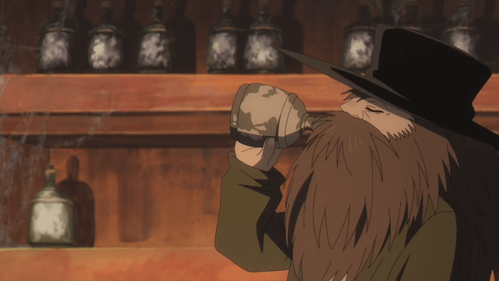 Back to the present, three months passed and Frieren was finally able to undo the magic barrier over the door. The storeroom was now open. It was full of well-preserved booze, but everyone quickly found out it tasted horrible. Nevertheless, everyone had fun that night. Frieren remembered that Heiter said the best thing was to laugh it off and enjoy bad booze with good friends. Fass seemed to feel the same way. If he was keenly disappointed, it didn’t last long. He shared the alcohol with the whole town and said he had never had such a fun night. That wraps up the first half of the episode.