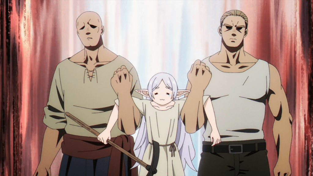 Frieren didn’t have nearly enough coins to cover the debt. It would have been 300-500 gold coins, and Frieren had less than a hundred. Long story short, Frieren got enslaved and told she must work in the mines for 300 years to pay off the debt. They even took her clothes and most of her belongings as collateral. Fern and Stark wanted to help, but they were at a complete loss about what to do. As Frieren gave a sad, pathetic farewell, she was carried away by a pair of buff men from the mines.
