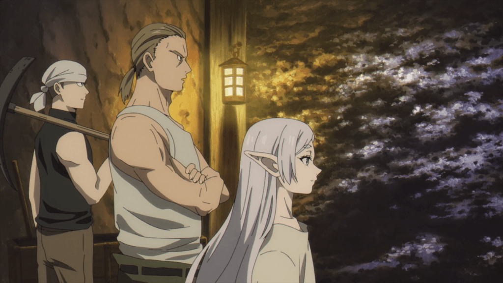 In the mine, Frieren used some kind off cool magic to tell the miners in which direction to dig. That night, she was visited by the boss of the Norm Company who told her that if they could strike silver, they could turn a profit capable of paying the debt several times over. The Norm Company had fallen on hard times, having lost a third of their military force to demons. They couldn’t open trade routes without proper defense and manpower. But if there was silver in the mine, the company would rebuild without any issue. The trade routes would reopen. The people of the north would be fed again as fresh bread was distributed. The boss of the Norm Company may have seemed scummy, but he was trying to save as many people as possible. Naturally, Frieren found the silver on her very first night in the mine.