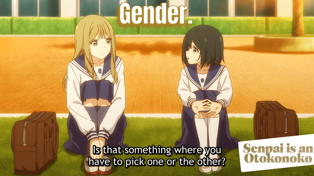 Now we know that Otokonoko can basically mean “AMAB presenting femininely.” The main character of Senpai is an Otokonoko is Makoto, an individual who was assigned male but who prefers to present femininely at school. But you may be wondering why this title was chosen. What does it truly mean? In the worst reading, the author could have been going out of their way to emphasize that Makoto was AMAB, thus drawing attention to their “biological sex” instead of their gender. However, since the anime is so gender-affirming and the characters are so genuinely written, I have a hard time believing the author was transphobic in this way. Most likely, the author chose this title with the intent of appealing to those who have claimed the term Otokonoko for themselves in its second meaning.