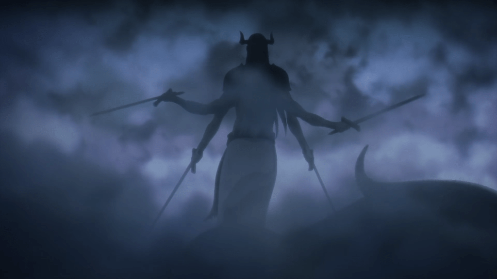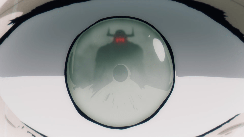 The episode opened on an intense scene of a human village being destroyed by demons. The villagers were being cut down in the streets and hunted in their own homes. A team of men in reddish-brown capes came to fight the demons, and one of them sent a letter via pigeon to call for additional help. Through the eyes of the man releasing the pigeon, we saw the largest and most dangerous demon: it was at least twice as tall as a human, with two horns and three evil red eyes. The scene ended there, but we know from later in the episode that none of the villagers nor the brave, caped warriors survived.