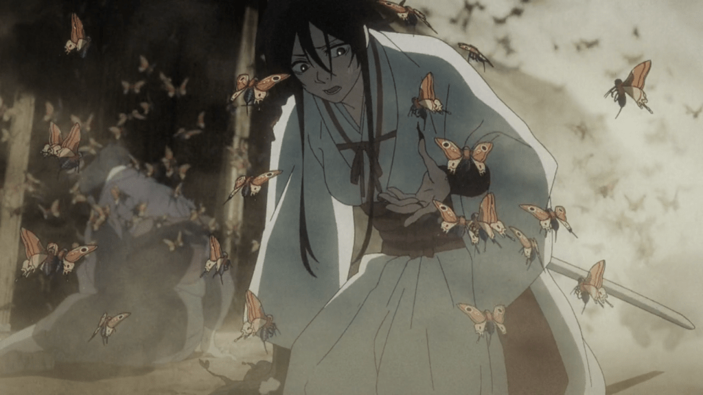 As for Ju Fa, he was being burned by the Water Tao spirits that Choubei had stolen from Rien. He had hidden them by swallowing them earlier. Then he cut the bottles out of his belly during battle. (It seems like he wouldn’t be fine after slicing open his gut, but then again, this is anime.) Choubei was enjoying slowly melting Ju Fa with the liquid water Tao. However, in my favorite Gantetsusai moment thus far, the big swordsman finished off Ju Fa, putting him out of his misery. All that was left was a chrysanthemum. Tamiya then set the peach next to the yellow flower, reuniting the spirits of the Tensen lovers as they passed on. The humans were victorious.