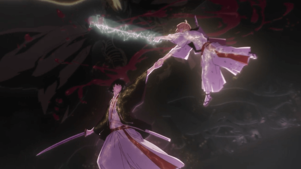 The flower monster continued its attacks, reacting to everyone at once. Gantetsusai charged forward, saying he’d open a path for Fuchi and Touma. On his way closer to the monster, the big swordsman was hit multiple times by impaling vines from the enemy. But he kept fighting onward, fueled by the urgency of the situation and pure adrenaline. There was also a cool moment when Touma protected Fuchi, taking a Tao-infused shot to the back and still standing. Thanks to that, Fuchi got his head back in the game. When Gantetsusai unleashed a huge sword-strike, it cut Ju Fa and Tao Fa apart. That’s when Fuchi and Touma struck, fatally attacking the Tanden of Tao Fa.