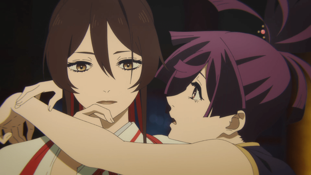 Meanwhile, Shion and Nurugai were sneaking through the outdoor courts in the dark night. It was incredibly sweet when Shion told Nurugai he would protect her “until the light leaves my eyes” or literally “until my eyes turn dark.” Nurugai didn’t understand the idiom, which was humorous. But I thought it was great that Shion promised to take Nurugai to a peaceful home in the mountains. Of course, I hope this was more of a fatherly gesture on Shion’s part than a romantic proposal. But with the cultural practices of that time, a girl of Nurugai’s age could be bethrothed to a man decades older and nobody would bat an eye. Even assuming Shoin is in his 20s, it wouldn’t matter, because Nurugai is still a teenager. Whether it’s wholesome or not, Shion and Nurugai’s interesting relationship dynamics will have to wait, because they were attacked by ninjas intent on killing them.